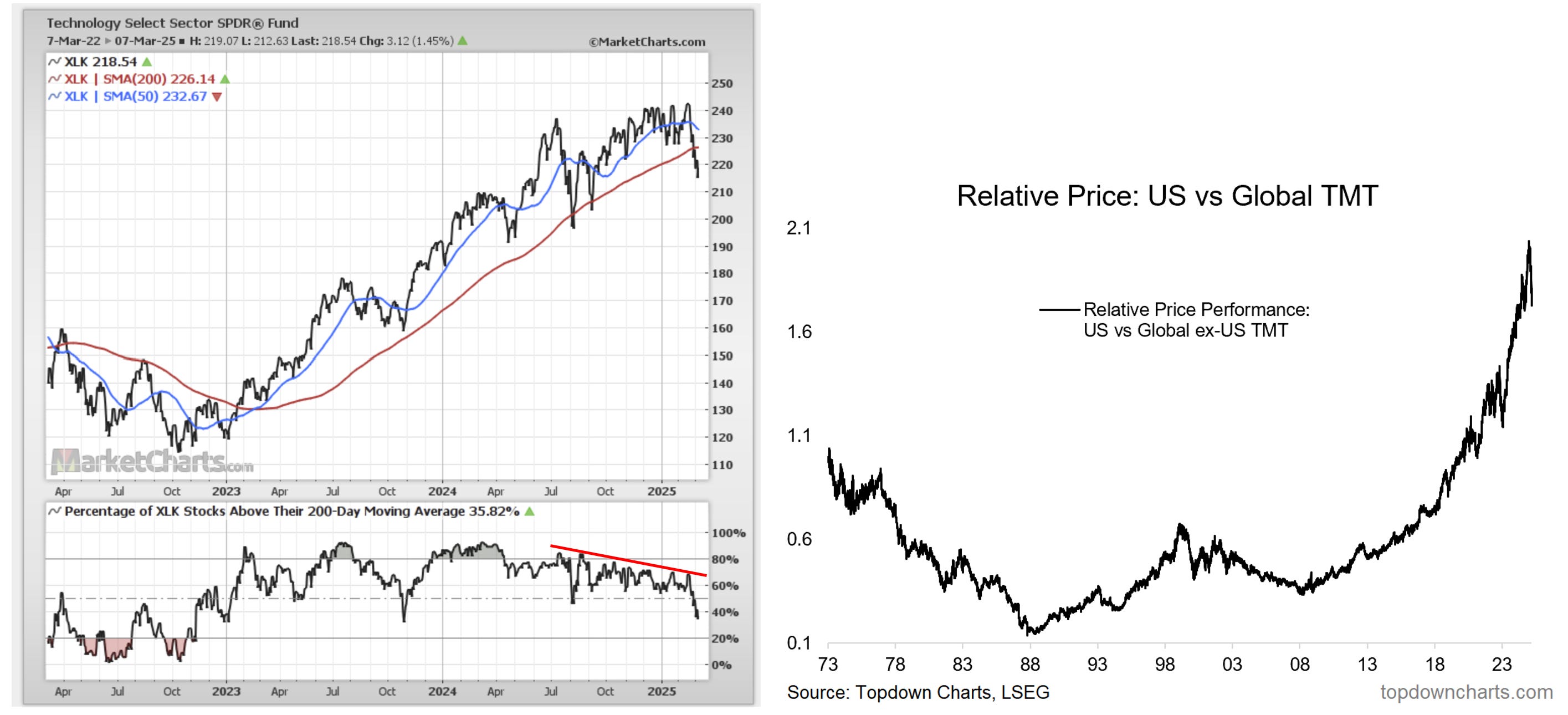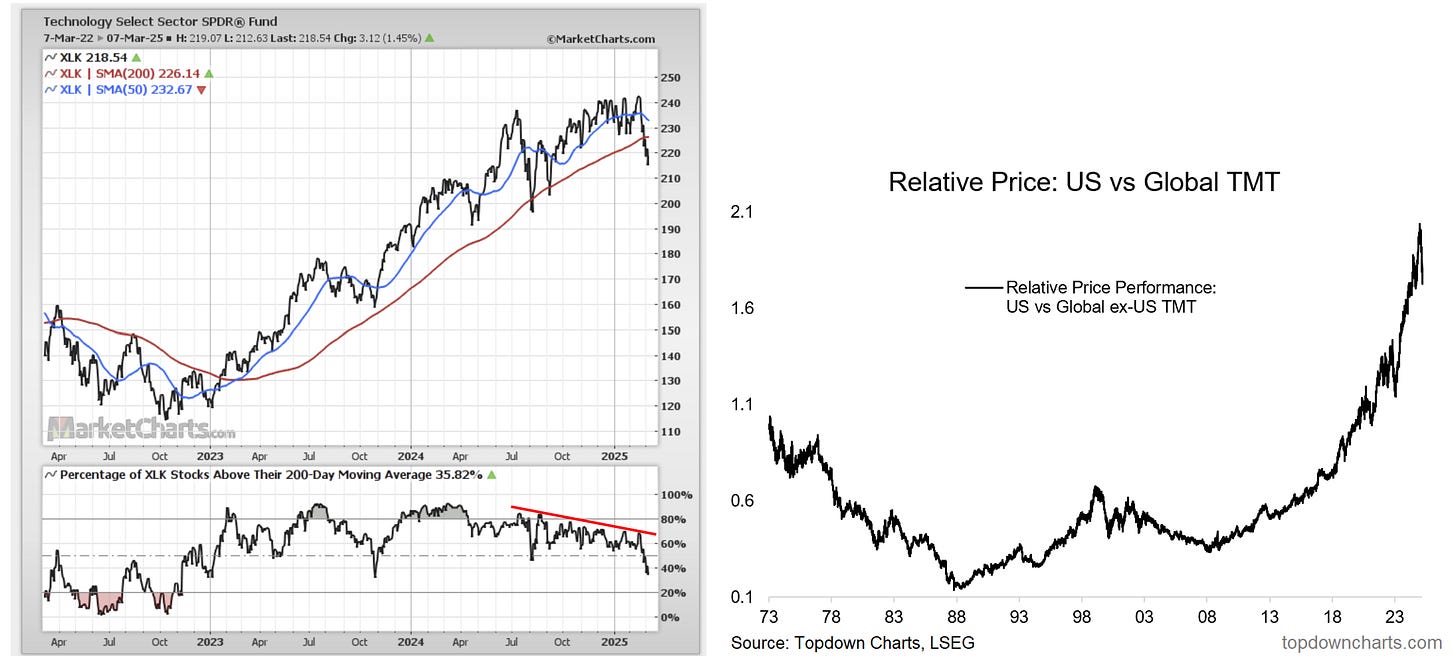 Tech stocks have broken below a couple of key supports, with breadth and intermediate trend significantly deteriorating. Likewise, US tech stocks in particular have pulled back significantly from the relative highs vs global tech stocks.