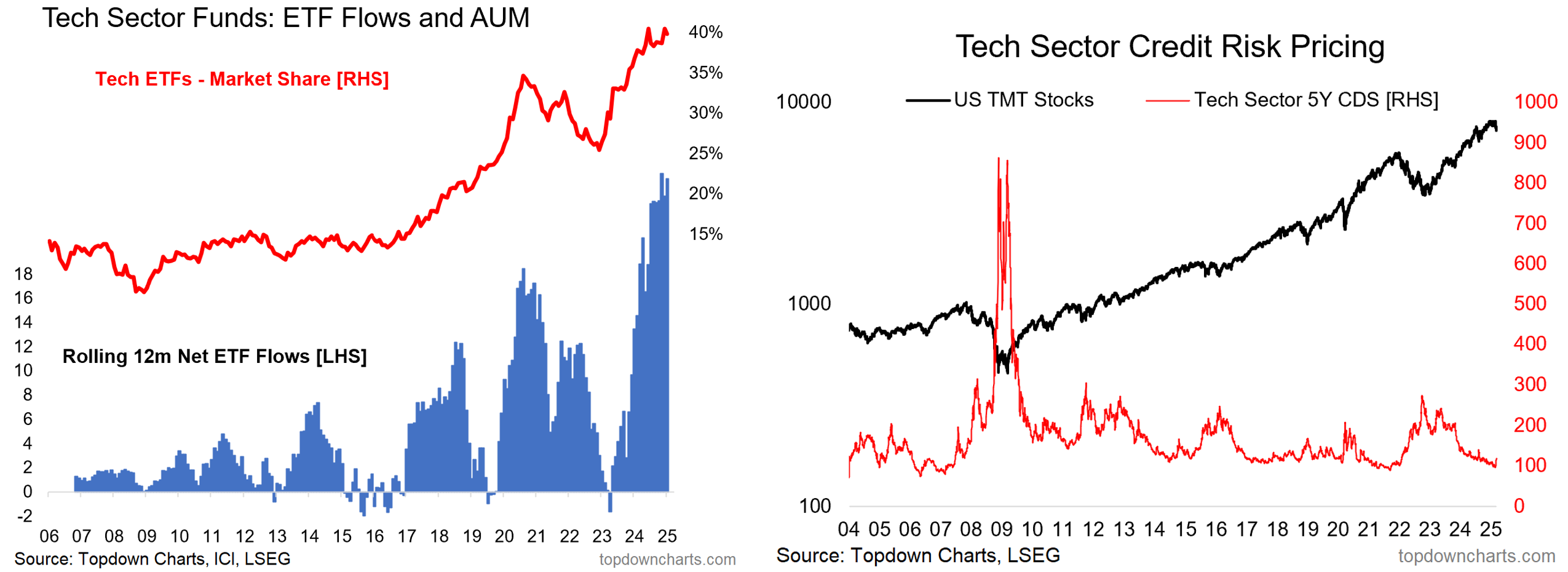This follows a period of frenzied flows into tech funds and record high allocations by investors to the sector. It also comes as tech sector CDS pricing had reached complacent levels (but now turning up).