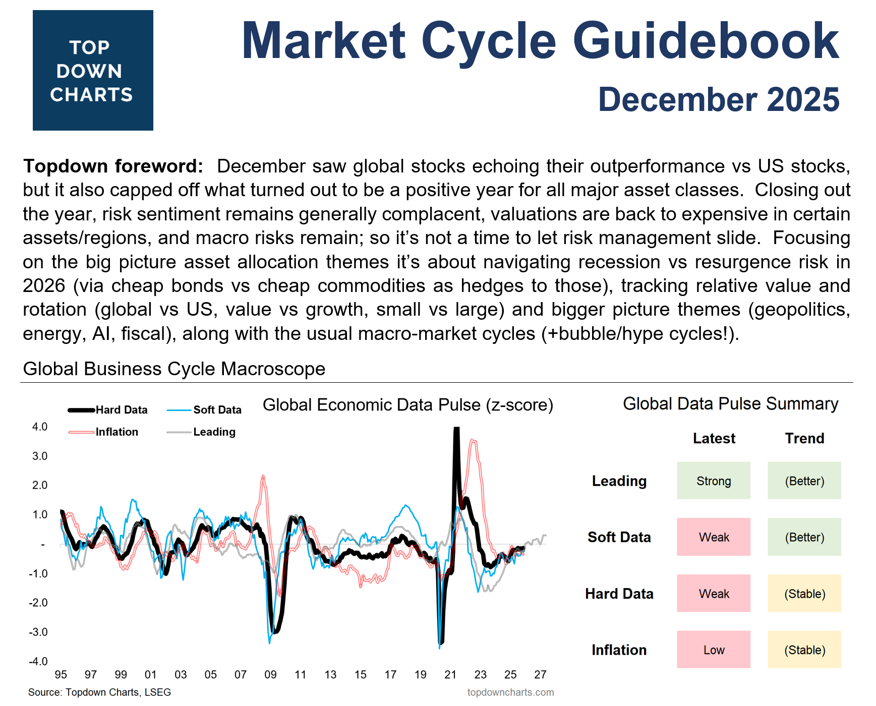 The monthly Market Cycle Guidebook is a key resource for multi-asset investors — providing insight into the stage of the business cycle, monetary policy trends, leading indicators, earnings momentum, valuations across multiple different assets and markets, long-term return expectations, and tactical asset allocation views.