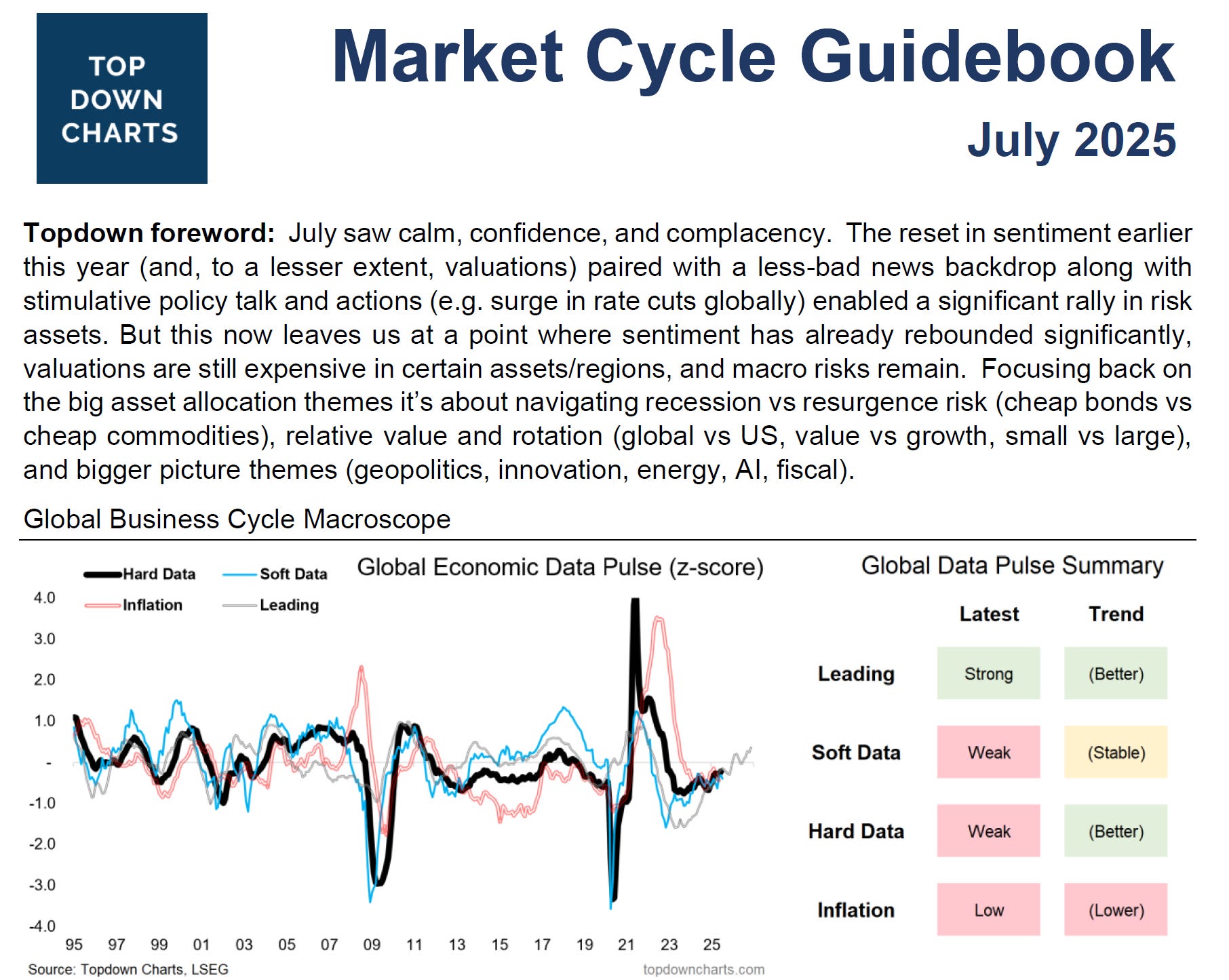 The monthly Market Cycle Guidebook is a key resource for investors — providing insight into the stage of the business cycle, monetary policy trends, leading indicators, earnings momentum, valuations across multiple different assets and markets, long-term return expectations, and tactical asset allocation views.