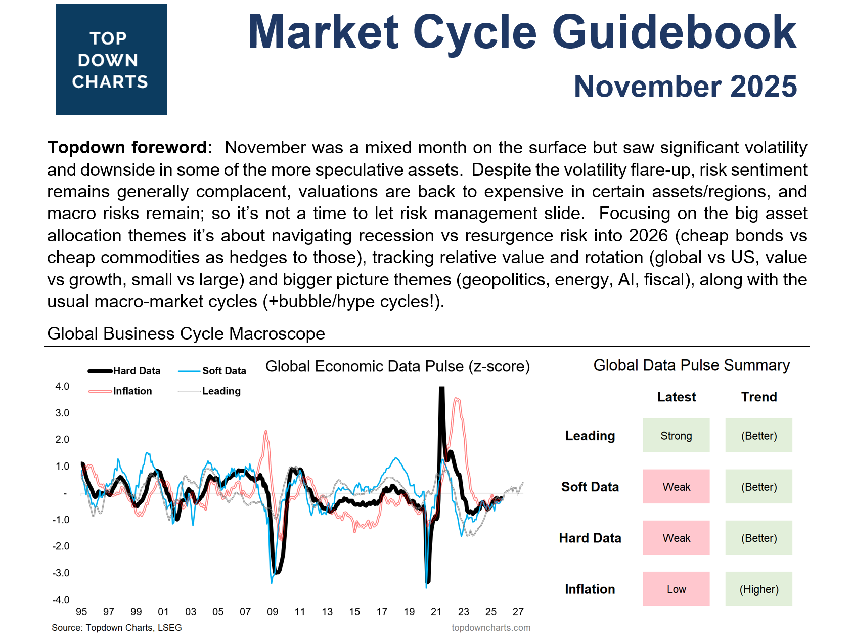 The monthly Market Cycle Guidebook is a key resource for multi-asset investors — providing insight into the stage of the business cycle, monetary policy trends, leading indicators, earnings momentum, valuations across multiple different assets and markets, long-term return expectations, and tactical asset allocation views.