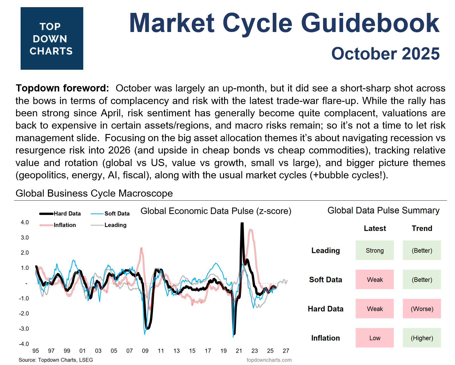 The monthly Market Cycle Guidebook is a key resource for multi-asset investors — providing insight into the stage of the business cycle, monetary policy trends, leading indicators, earnings momentum, valuations across multiple different assets and markets, long-term return expectations, and tactical asset allocation views.
