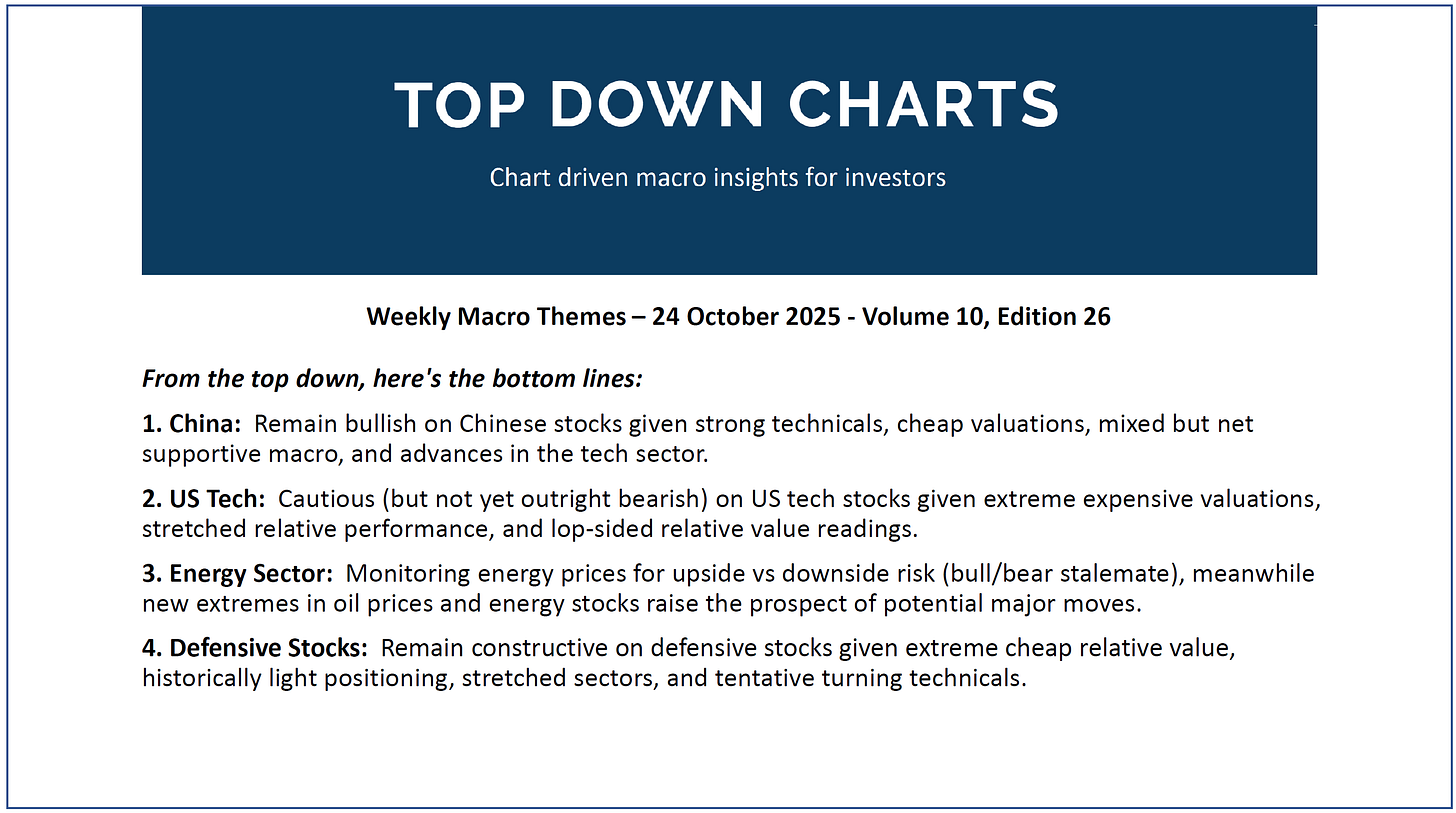 2. US Tech: Cautious (but not yet outright bearish) on US tech stocks given extreme expensive valuations, stretched relative performance, and lopsided relative value readings.